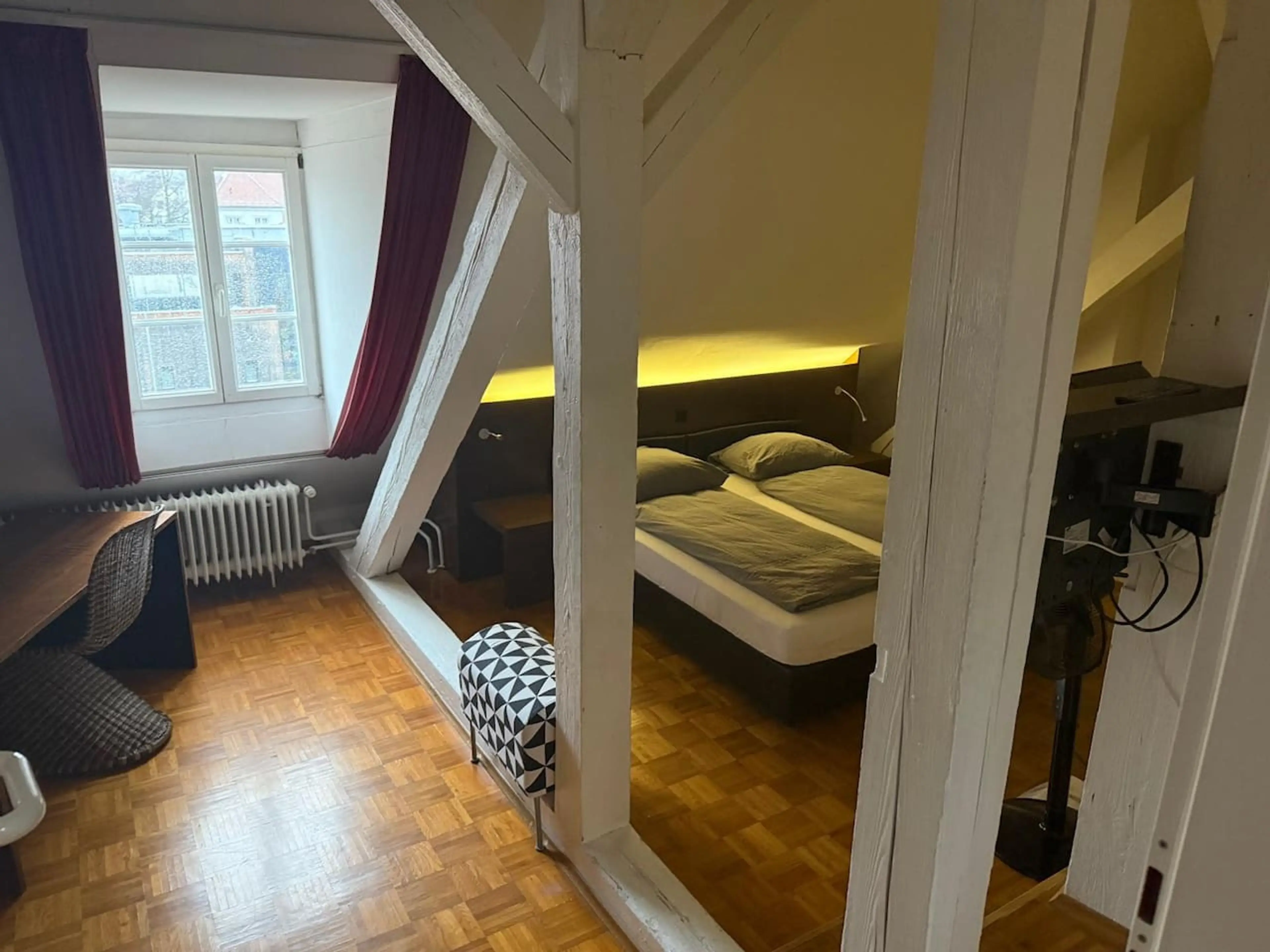 Welcome to our Tower Suite, the most spacious and an unique apartment in our building, ideal for up to five guests. A wooden staircase leads into a bright, open space with warm wooden details and plenty of natural light. The private balcony offers a full panoramic view over the rooftops of Konstanz...